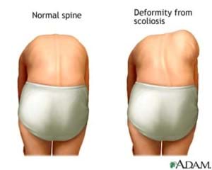 The most common test for the prescence of Scoliosis is the Adams forward bend test (image to the left).